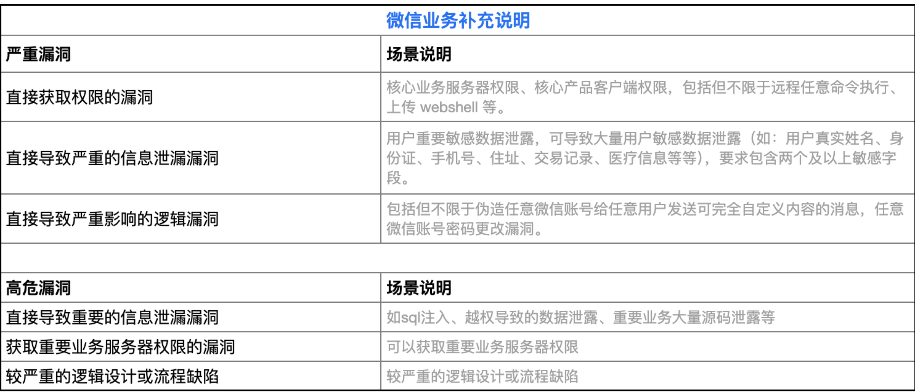 微信客户端、微信登录、聊天、朋友圈、音视频、视频号、直播、小程序、游戏(小程序只收取影响小程序框架的高危漏洞)、微信支付(微信支付功能,微信钱包,微信支付商户平台,微信支付自研刷脸和刷掌设备,微信信用卡还款等)